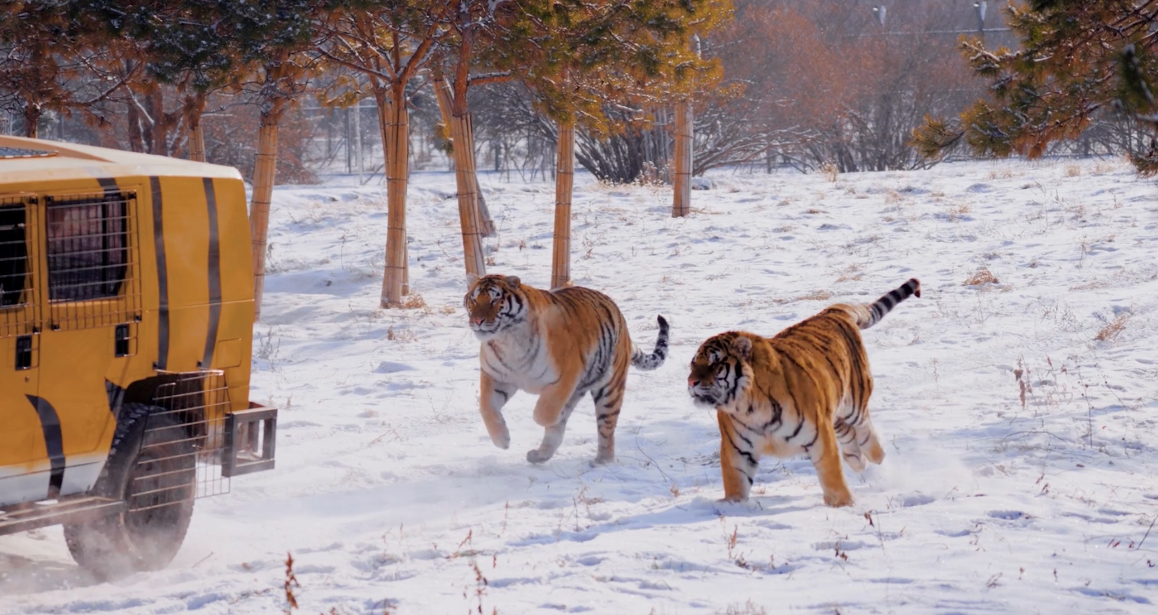兩只小老虎在雪地里相互追逐打鬧