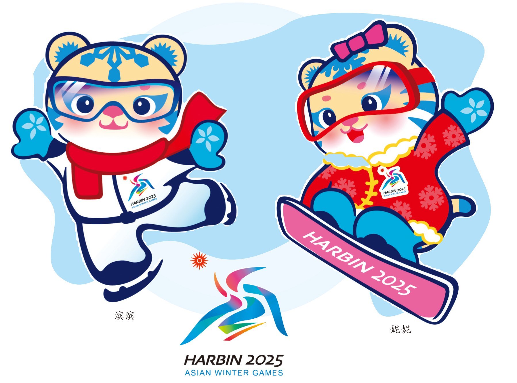 本屆亞冬會的吉祥物,是兩只可愛的東北虎。腳上穿著冰刀的那只小老虎,名字叫“濱濱”,哈爾濱的“濱”;另一個腳踩滑雪板的,名叫“妮妮”,諧音是“您”。合在一起,寓意為“哈爾濱歡迎您”。