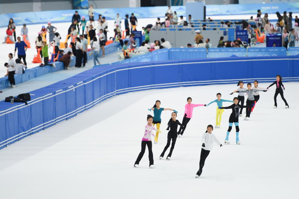 2023年7月1日,小朋友在“冰絲帶”練習花樣滑冰。新華社記者 鞠煥宗 攝
