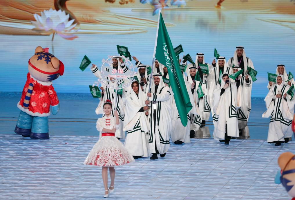 2月7日,沙特阿拉伯體育代表團在第九屆亞洲冬季運動會開幕式上入場。新華社記者 楊磊 攝