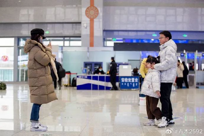 在外地上班的于女士,帶著女兒和前來(lái)送站的親人在車(chē)站內(nèi)合影留念。