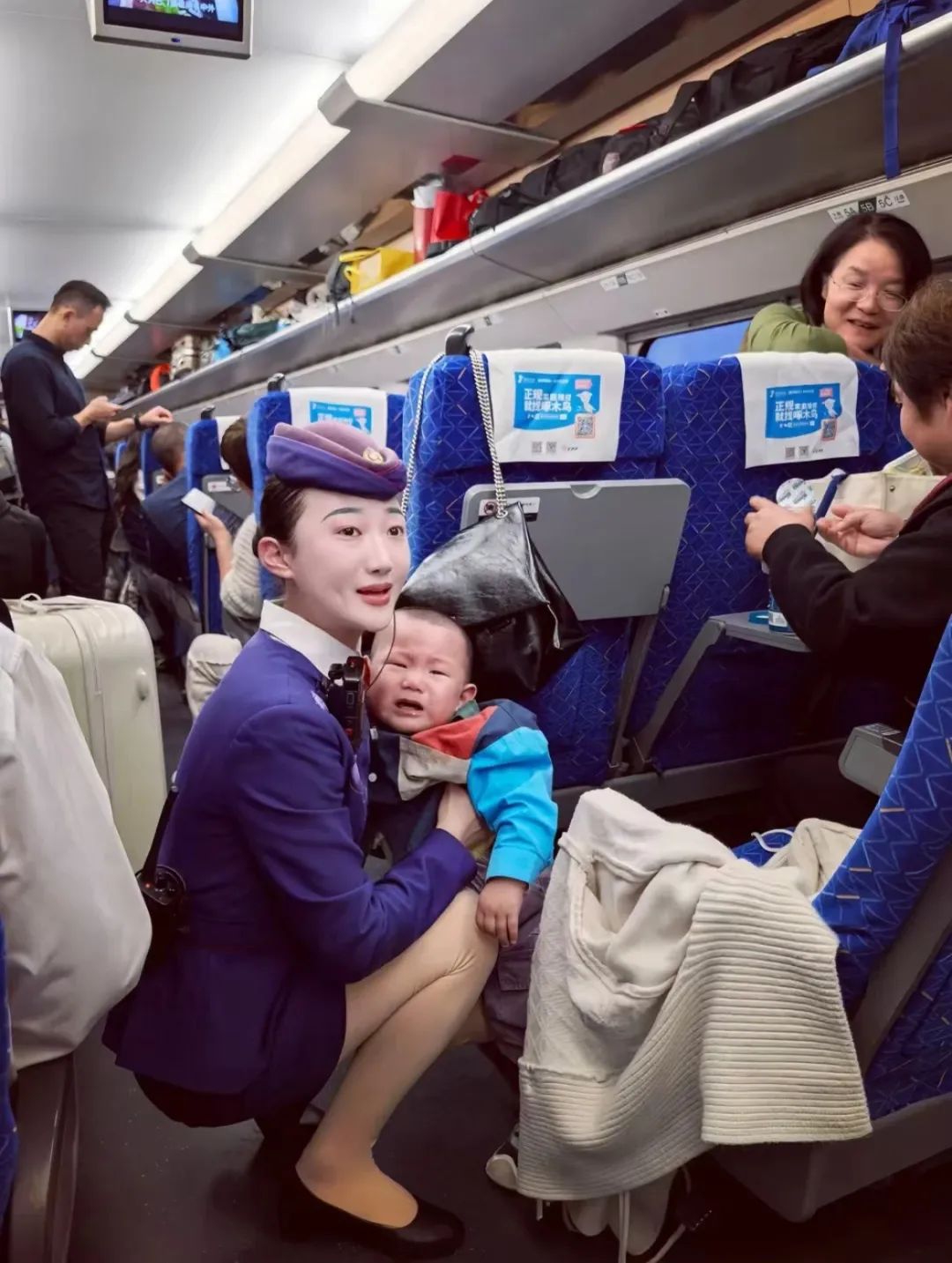 中國(guó)鐵路濟(jì)南局集團(tuán)有限公司青島客運(yùn)段北京動(dòng)車(chē)隊(duì)的賈雯乘務(wù)員,耐心地幫助旅客安撫哭鬧的孩子,讓我在新的一年感受到了列車(chē)上的溫馨與真情。