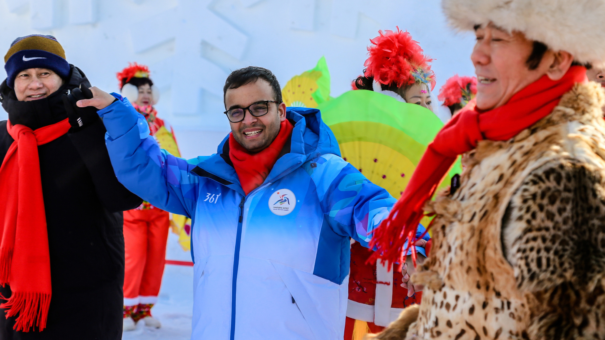 第九屆亞冬會在哈爾濱舉辦期間,一場主題為“當(dāng)亞冬會遇上非遺年——亞洲多國人士冰城同慶新春”的人文交流活動在哈爾濱舉行。活動當(dāng)天,在哈爾濱雪博會中央廣播電視總臺演播室前的廣場上,20多人組成的民間秧歌隊(duì)在哈爾濱中央大街形象大使甲繼海的帶領(lǐng)下,為各國來賓激情演繹迎賓秧歌舞。