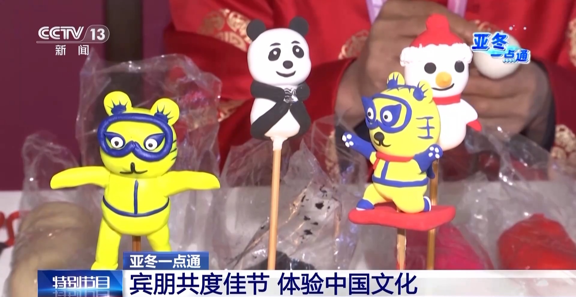 我旁邊就是面塑技藝的展臺,面塑在漢代就有文字記載,唐宋與曲藝結合,明清成為謀生的手段。制作材料以面粉、糯米粉為主,搭配蜂蜜等,可用食用色素調色。這也是我們國家的非物質文化遺產,運動員可以到這里一起來感受和體驗非遺項目,現在工作人員正在做的吉祥物一會兒會送給運動員。