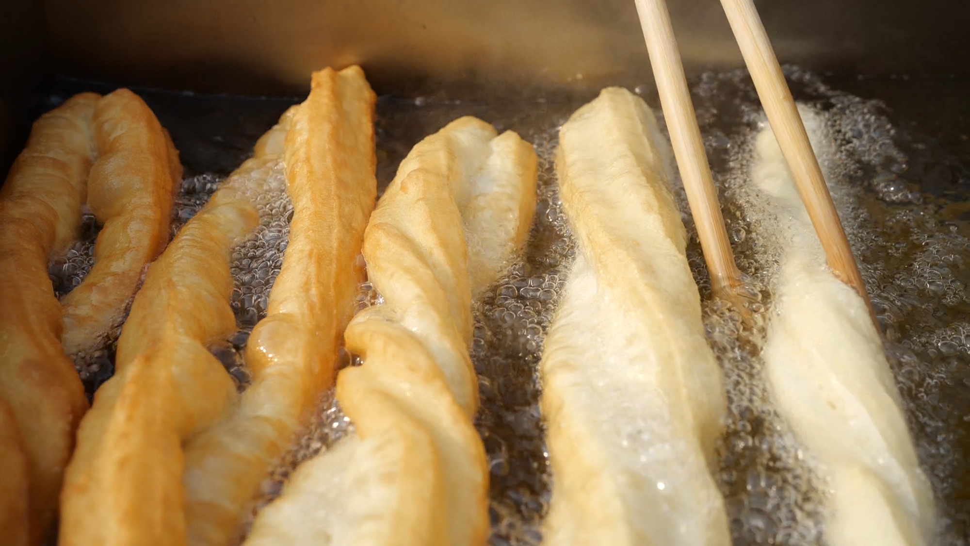 史梅菊賣早餐賣了二三十年,今年她和小叔子江新軍代表江莊村參賽。為防止面團粘連,史梅菊用搟面杖在油鍋里沾點油后,再把面團搟成長面餅狀。用刀快速切條,兩個面餅條疊在一起,史梅菊再用手摁壓幾下,給油條在鍋里留足發(fā)酵空間,以此保持油條的蓬松感。江新軍負責不停地翻轉(zhuǎn)鍋里的油條。