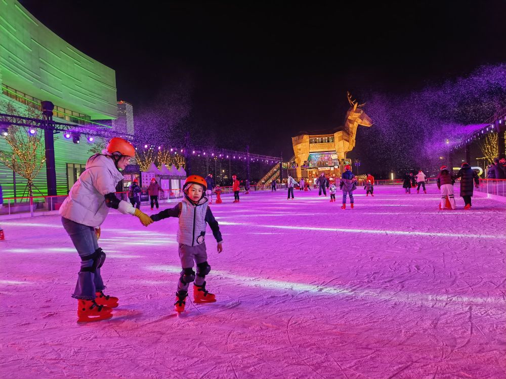 在上海徐匯濱江,“樂滑之夢(mèng)”和西岸夢(mèng)中心聯(lián)手打造的戶外水岸冰場(chǎng)熱鬧非凡。伴隨節(jié)奏感強(qiáng)的音樂和靈動(dòng)燈光,上海市民周雄和兒子手牽手,在冰面上練習(xí)滑行。
