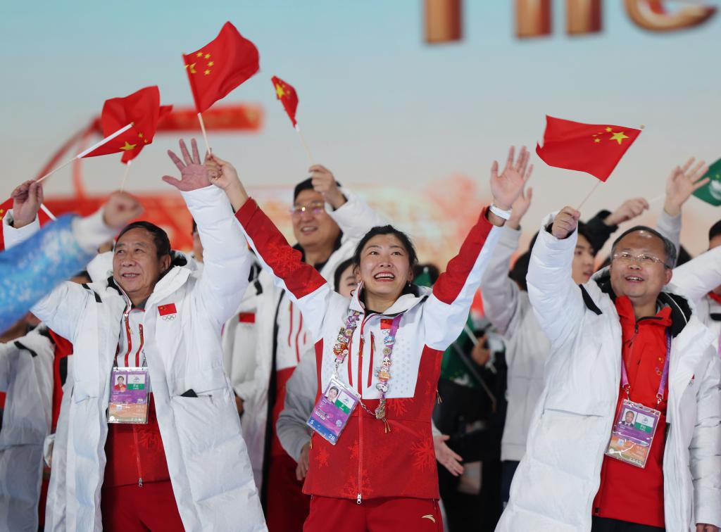 2月14日,中國體育代表團(tuán)旗手徐夢桃(中)在亞冬會閉幕式上。新華社記者 張濤 攝