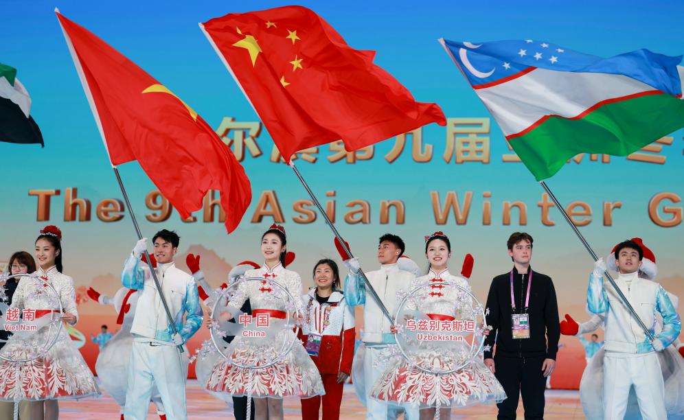 2月14日,第九屆亞洲冬季運(yùn)動會閉幕式在哈爾濱舉行,這是各體育代表團(tuán)入場環(huán)節(jié)。新華社記者 許雅楠 攝