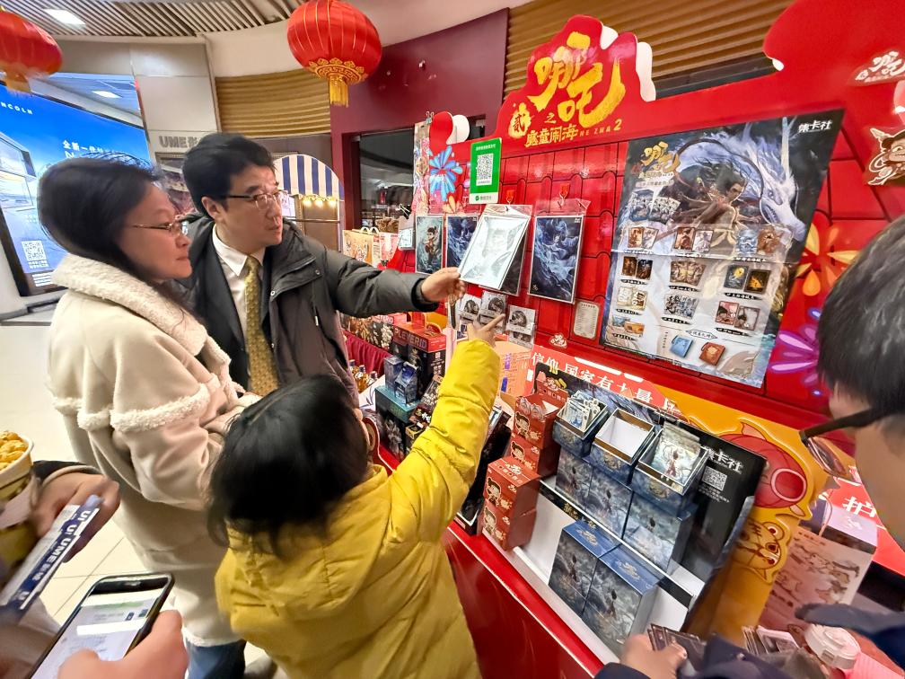2月14日晚,在北京市海淀區(qū)的UME國際影城(華星店),家長帶著孩子挑選電影紀念品。新華社記者 才揚 攝
