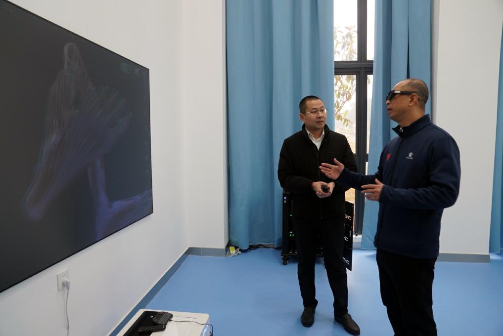 2月17日,在廣西體育高等??茖W(xué)校,韋軍與運(yùn)動(dòng)健康學(xué)院的老師交流,了解3D模擬運(yùn)動(dòng)解剖模型如何助力教學(xué)。新華社記者 陳露緣 攝
