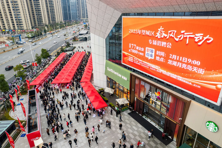這是2025年2月11日在湖南省長(zhǎng)沙市望城區(qū)龍湖月亮島天街商場(chǎng)外坪拍攝的招聘會(huì)現(xiàn)場(chǎng)(無人機(jī)照片)。新華社記者 陳思汗 攝