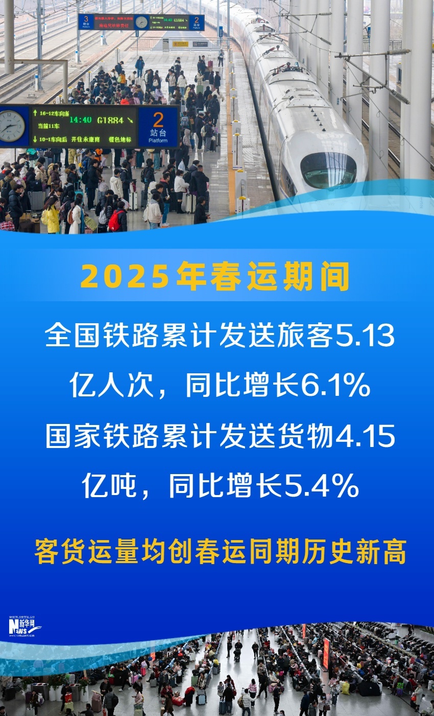 為期40天的2025年鐵路春運(yùn)圓滿(mǎn)收官。春運(yùn)期間,全國(guó)鐵路累計(jì)發(fā)送旅客5.13億人次,同比增長(zhǎng)6.1%,國(guó)家鐵路累計(jì)發(fā)送貨物4.15億噸,同比增長(zhǎng)5.4%,客貨運(yùn)量均創(chuàng)春運(yùn)同期歷史新高。