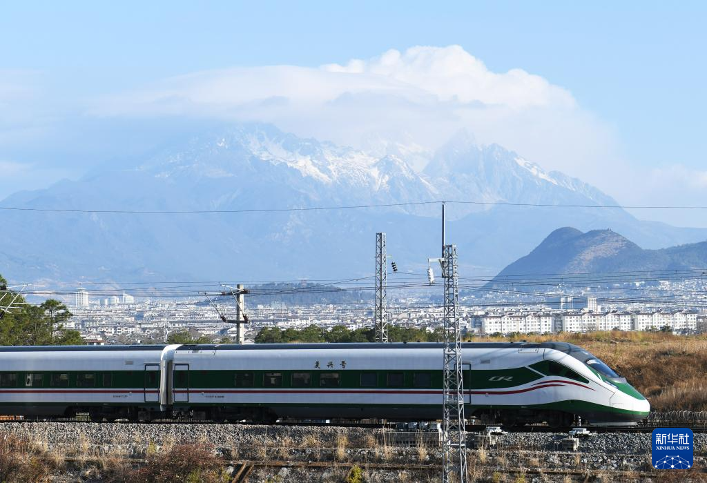 圖為2月22日,一列動(dòng)車(chē)組列車(chē)行駛在云南麗江玉龍雪山腳下的麗香鐵路線上。