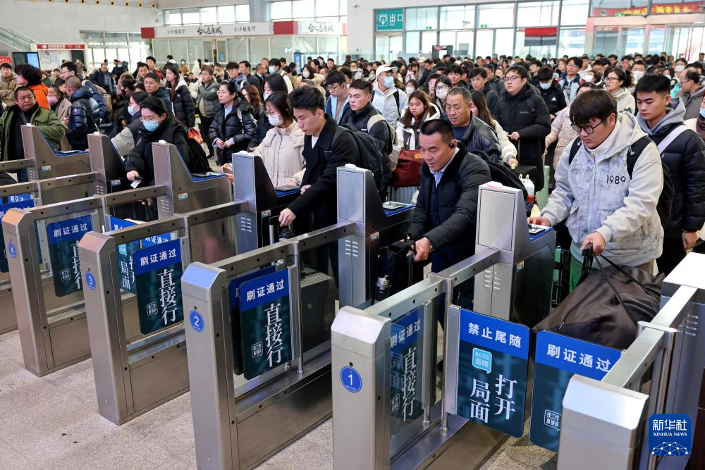圖為2月22日,旅客在山東棗莊站通過(guò)閘機(jī)檢票進(jìn)站。