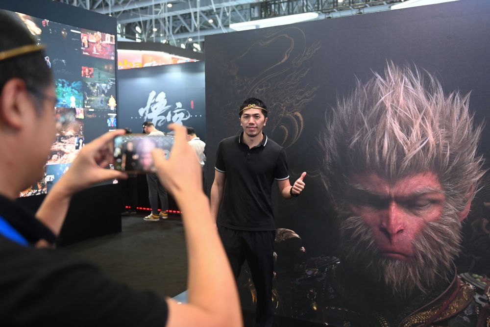 2024年9月25日,觀眾在第三屆全球數(shù)字貿(mào)易博覽會(huì)的游戲科學(xué)展區(qū)打卡。新華社記者 黃宗治 攝
