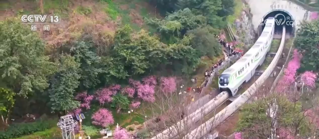 二月下旬,重慶渝中區(qū)佛圖關(guān)公園的美人梅逐漸進(jìn)入盛放期,粉色花海間,列車穿行而過,繪就了一幅爛漫的春景圖。這趟“開往春天的列車”吸引了很多市民前來打卡拍照,記錄春日美好時(shí)光。