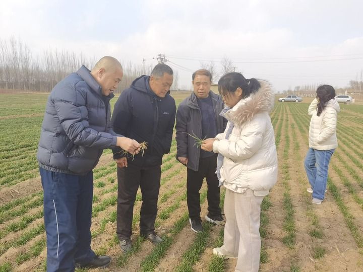 山東省夏津縣農(nóng)業(yè)農(nóng)村局植物保護站站長、高級農(nóng)藝師鄭曰英(右二)正在開展小麥苗情調(diào)查、病蟲害監(jiān)測,并指導糧農(nóng)加強春季田管。