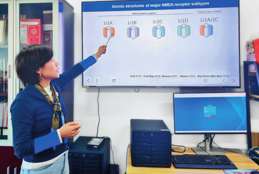 竺淑佳向記者介紹團(tuán)隊聚焦的NMDA受體相關(guān)研究(2025年1月攝)。董雪攝/本刊