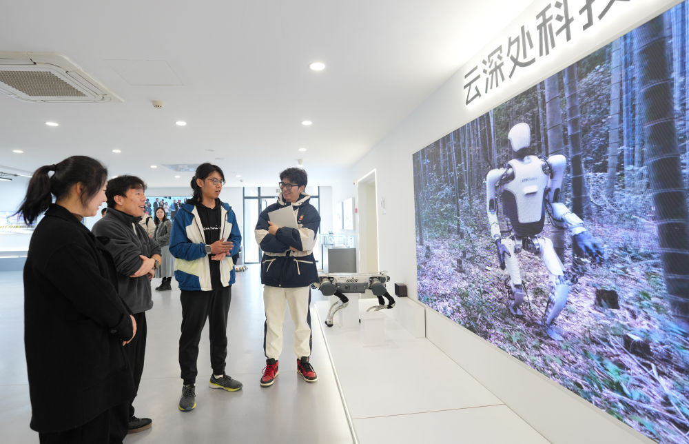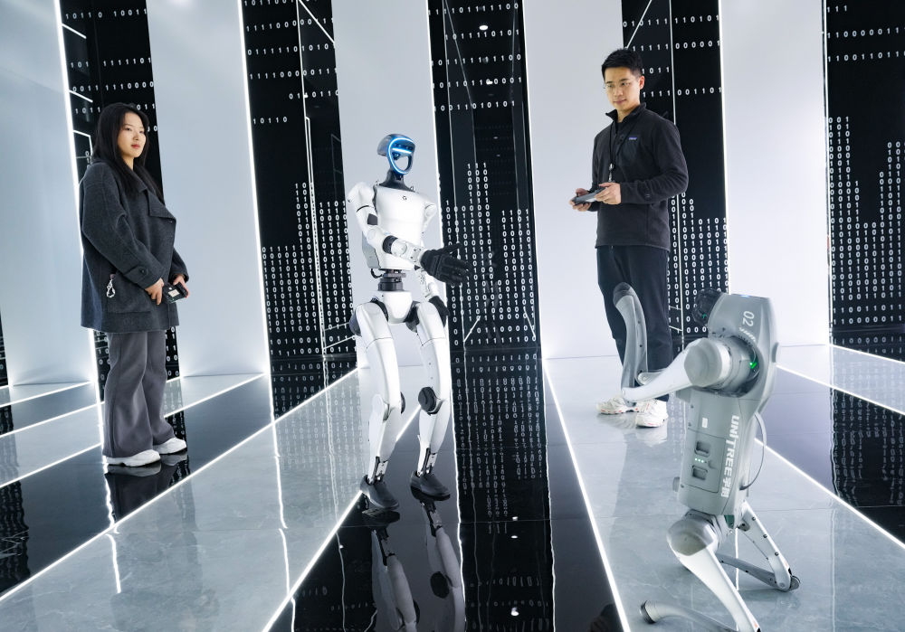 3月1日,在杭州宇樹科技有限公司的產品展示中心,人形機器人和四足機器人在工作人員控制下做動作。新華社記者 翁忻旸 攝