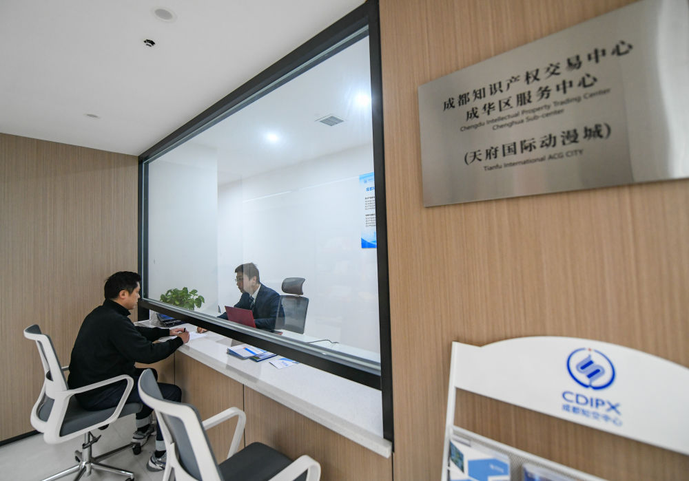 2月27日,民營企業(yè)工作人員在成都知識產權交易中心成華區(qū)服務中心咨詢相關政策。新華社記者 王曦 攝