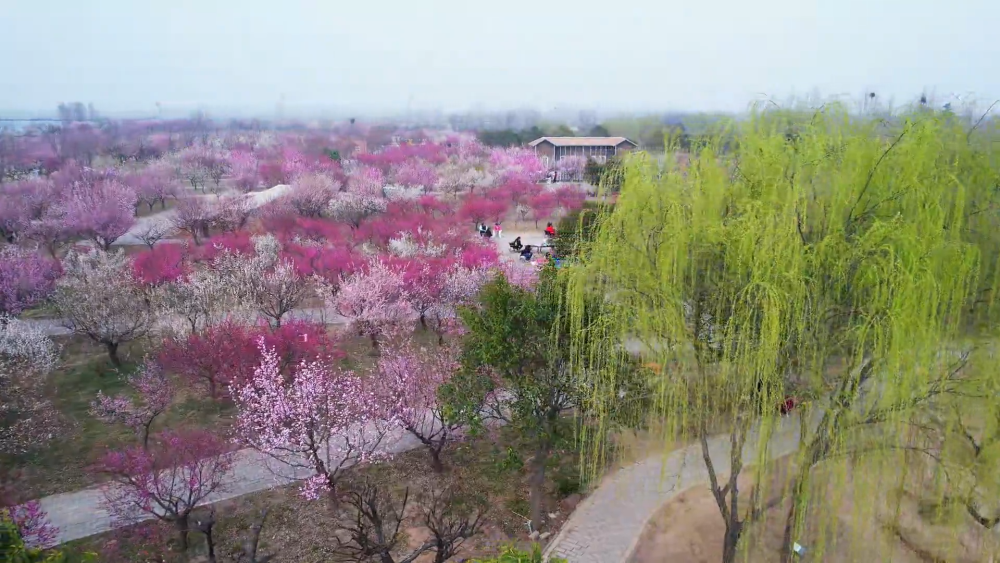 3月15日,游客在江蘇省鹽城市大豐區(qū)梅花灣景區(qū)賞花游玩(無(wú)人機(jī)照片)。新華社發(fā)(周社根攝)