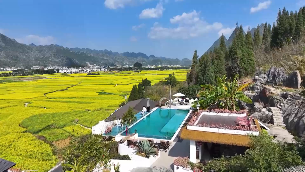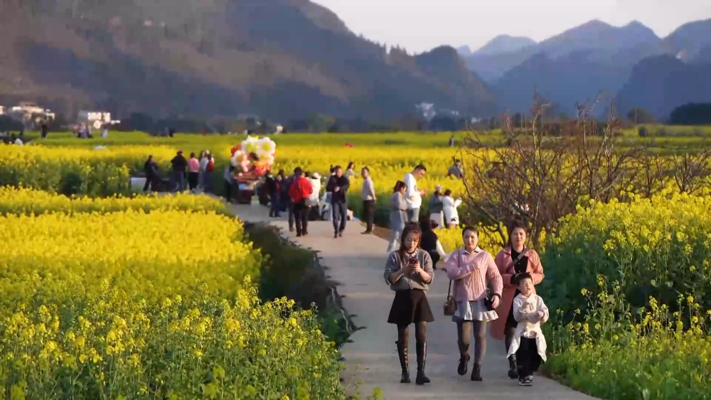 眼下,貴州省興義市萬(wàn)峰林景區(qū)內(nèi)的6000多畝油菜花競(jìng)相綻放,盛開(kāi)的油菜花與峰林、田園、村莊、河流交相輝映,金色花海染盡鄉(xiāng)野,形成一幅美麗的山水田園畫(huà),吸引了眾多省內(nèi)外游客前來(lái)觀賞打卡,欣賞春日美景。