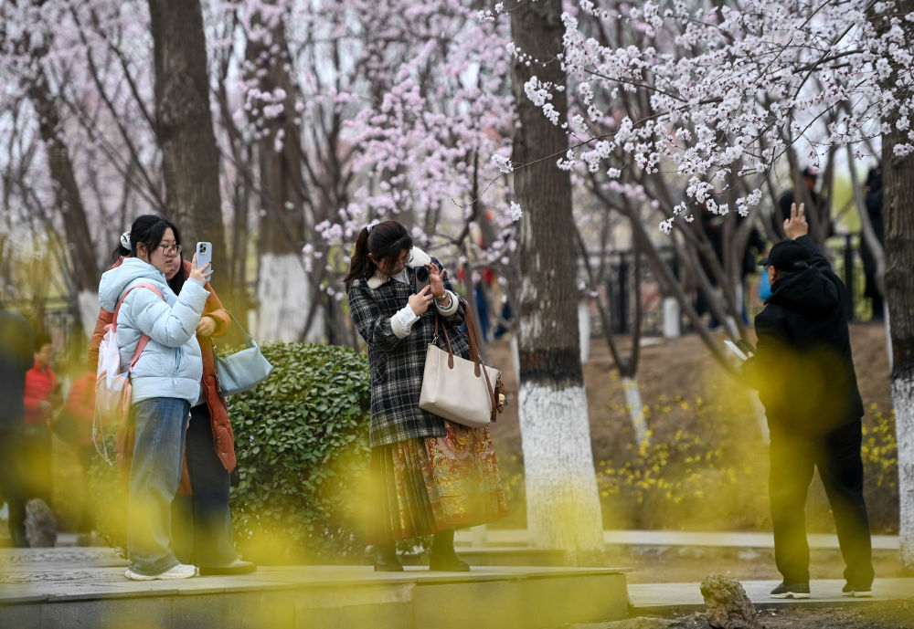 3月15日,游客在天津市紅橋區(qū)北運(yùn)河畔桃花堤賞花拍照。新華社記者 趙子碩 攝