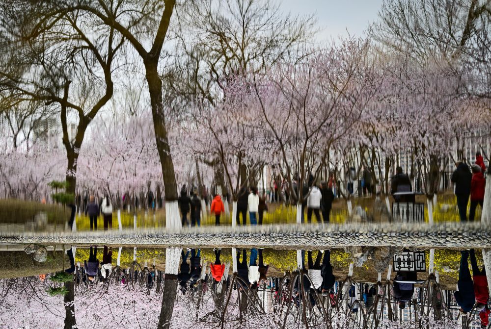 3月15日,游客在天津市紅橋區(qū)北運(yùn)河畔桃花堤漫步觀賞。新華社記者 趙子碩 攝