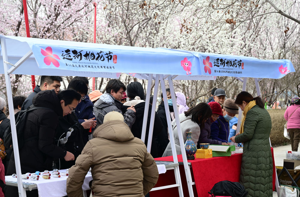 3月15日,游客在天津市紅橋區(qū)北運(yùn)河畔桃花堤設(shè)置的市集上選購(gòu)文創(chuàng)產(chǎn)品。新華社記者 趙子碩 攝