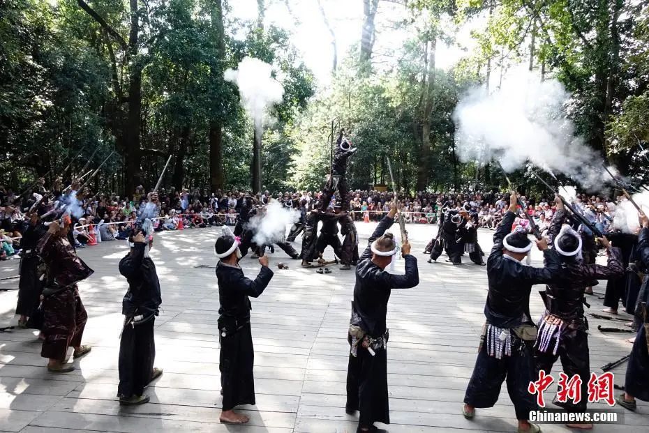 岜沙苗寨村民用火槍為游客表演。中新社記者 侯宇 攝