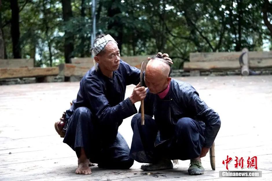 從江縣丙妹鎮(zhèn)岜沙苗寨,村民在向游客展示傳統(tǒng)的“鐮刀剃頭”技藝。張素 攝
