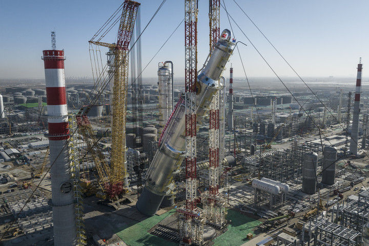 2月26日拍攝的華錦阿美精細(xì)化工及原料工程項(xiàng)目芳烴聯(lián)合裝置抽余液塔吊裝施工現(xiàn)場(chǎng)(無(wú)人機(jī)照片)。 新華社記者 潘昱龍 攝