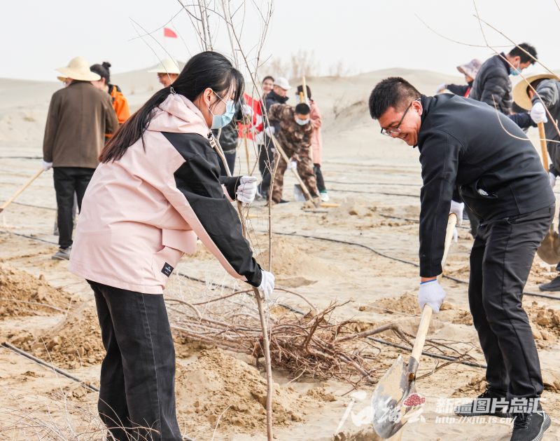 3月12日,在和田市現(xiàn)代農(nóng)業(yè)產(chǎn)業(yè)園區(qū)植樹(shù)點(diǎn),干部職工相互配合植樹(shù)。許曉龍攝