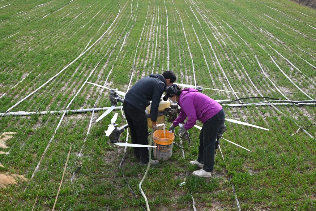 3月18日,在新疆喀什地區(qū)英吉沙縣一麥田,努日曼古麗和丈夫在為無人機添加農(nóng)藥。新華社記者 尹茹紅 攝