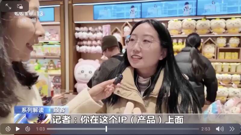 北京朝陽區(qū)的一家IP聯名店,可以看到首發(fā)、首秀的國產周邊衍生品。截圖來自央視新聞
