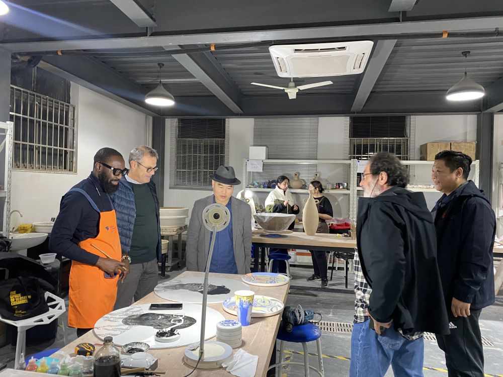 在景德鎮(zhèn)陶瓷大學(xué)國(guó)際陶藝工作室,剛果(金)陶藝家姆萬(wàn)加·斯坦尼斯正在與藝術(shù)家們交流創(chuàng)作心得。(受訪者供圖)