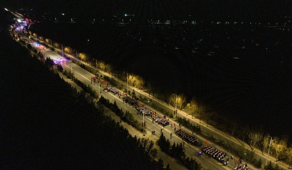 4月3日凌晨,參加徒步祭英烈活動(dòng)的師生從固原市城區(qū)出發(fā),前往位于彭陽(yáng)縣的任山河烈士陵園祭奠英烈(無人機(jī)照片)。