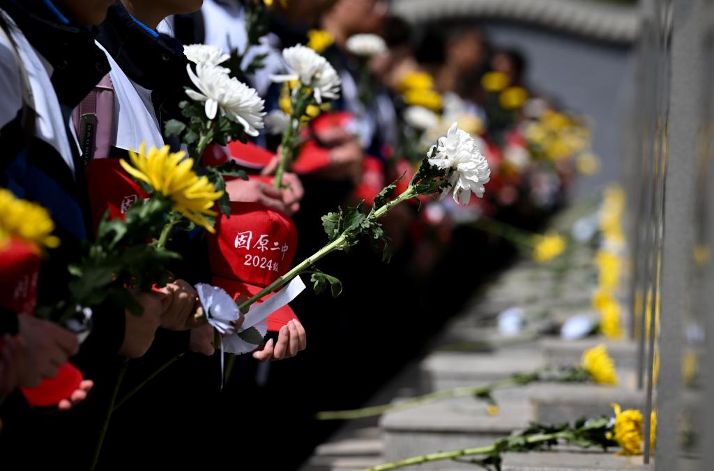 4月3日,抵達(dá)任山河烈士陵園的學(xué)生們手持白菊原地休整。