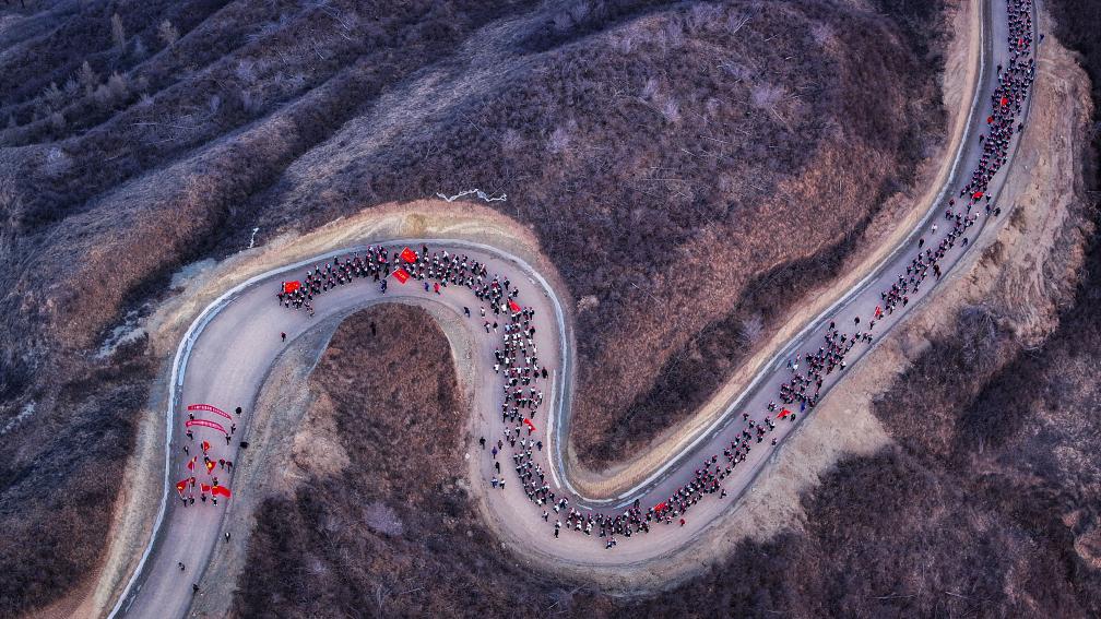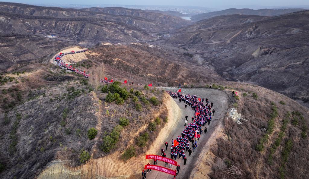 4月3日,參加徒步祭英烈活動(dòng)的師生在翻越黃峁山(無人機(jī)照片)。