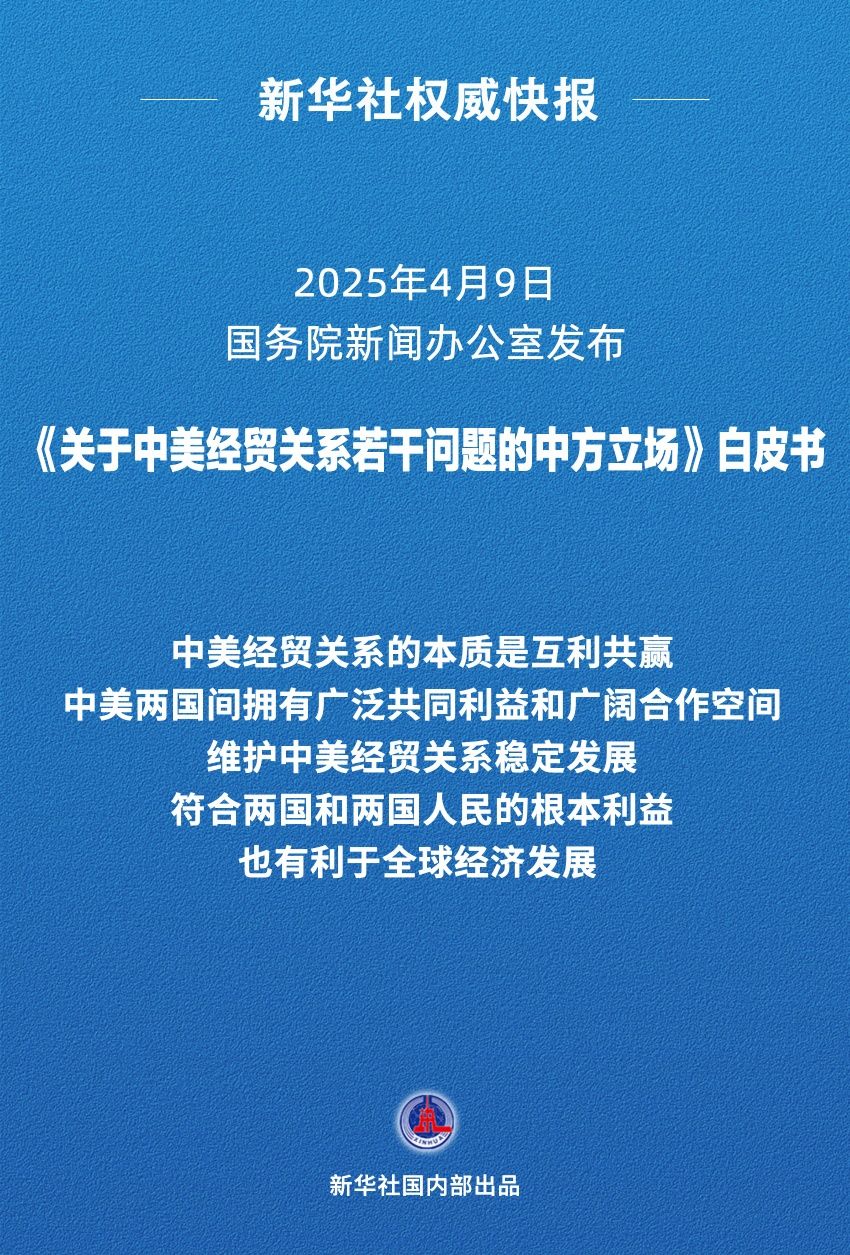 國務(wù)院新聞辦公室4月9日發(fā)布《關(guān)于中美經(jīng)貿(mào)關(guān)系若干問題的中方立場》白皮書,澄清中美經(jīng)貿(mào)關(guān)系事實(shí),闡明中方對相關(guān)問題的政策立場。