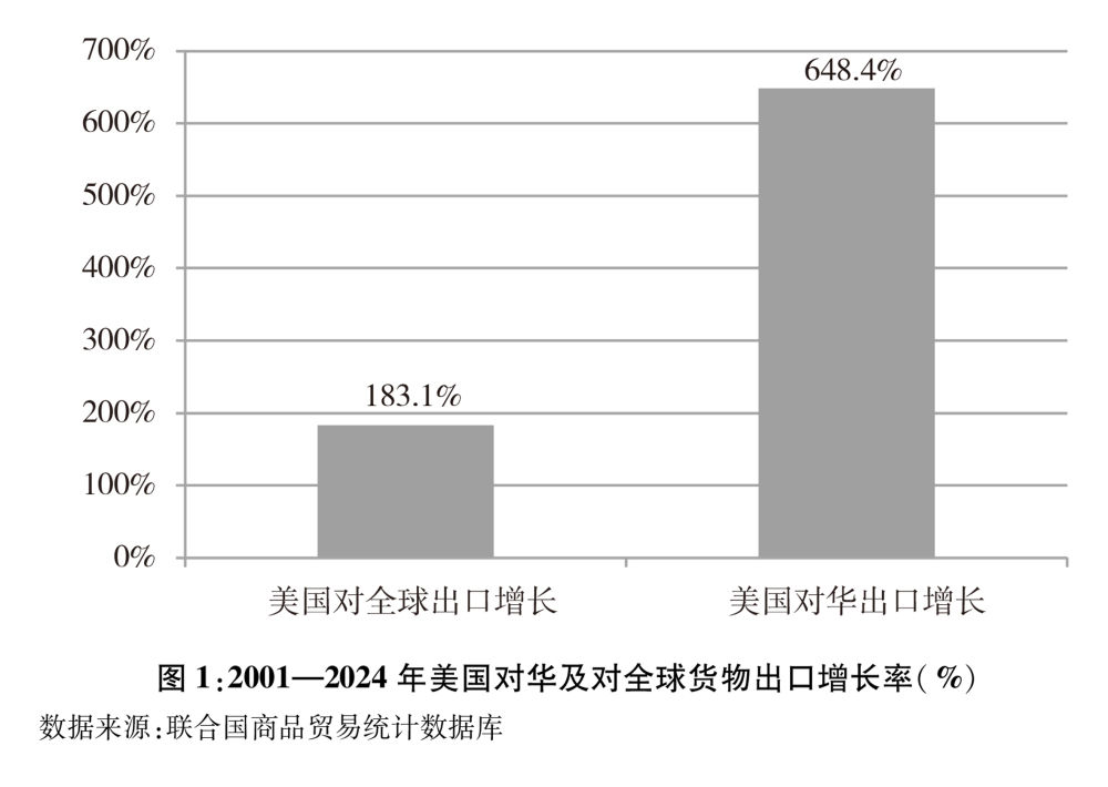 美國(guó)對(duì)華出口增速明顯快于其對(duì)全球出口。中國(guó)加入世界貿(mào)易組織以來,美國(guó)對(duì)華出口快速增長(zhǎng),中國(guó)成為美國(guó)重要的出口市場(chǎng)。根據(jù)聯(lián)合國(guó)統(tǒng)計(jì)數(shù)據(jù),2024年美國(guó)對(duì)華貨物出口額1435.5億美元,較2001年的191.8億美元增長(zhǎng)648.4%,遠(yuǎn)遠(yuǎn)高于同期美國(guó)對(duì)全球183.1%的出口增幅(圖1)。