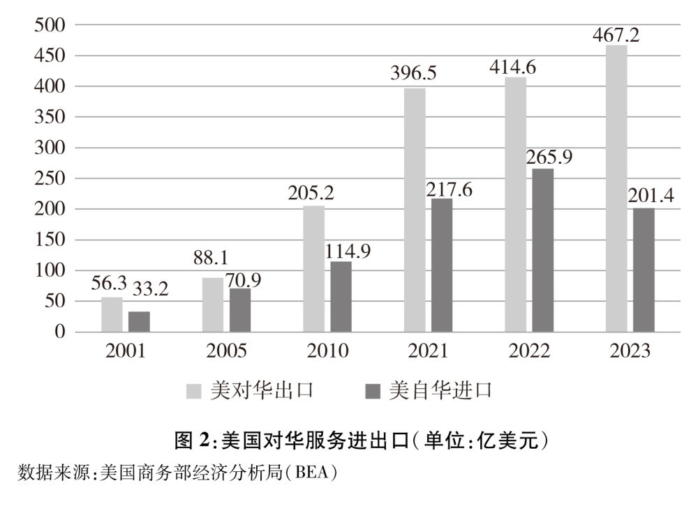 美國(guó)服務(wù)業(yè)產(chǎn)業(yè)門類齊全,具有較強(qiáng)國(guó)際競(jìng)爭(zhēng)力。總體來看,隨著經(jīng)濟(jì)不斷發(fā)展和人民生活水平提升,中國(guó)對(duì)服務(wù)需求明顯擴(kuò)大,中美雙方服務(wù)貿(mào)易快速增長(zhǎng)。據(jù)美國(guó)商務(wù)部統(tǒng)計(jì),2001-2023年,中美服務(wù)貿(mào)易額由89.5億美元擴(kuò)大到668.6億美元,增長(zhǎng)了6倍(圖2)。根據(jù)中方統(tǒng)計(jì),2023年,美國(guó)是中國(guó)第二大服務(wù)貿(mào)易伙伴;據(jù)美方統(tǒng)計(jì),中國(guó)是美國(guó)第五大服務(wù)出口目的地。