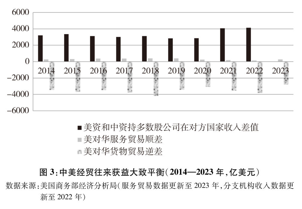 根據(jù)美國(guó)商務(wù)部數(shù)據(jù),2023年美國(guó)對(duì)華服務(wù)貿(mào)易順差為265.7億美元,美國(guó)在服務(wù)貿(mào)易方面占有顯著優(yōu)勢(shì);2022年美資企業(yè)在華銷售額高達(dá)4905.2億美元,遠(yuǎn)高于中資企業(yè)在美786.4億美元的銷售額,差額高達(dá)4118.8億美元,美國(guó)企業(yè)跨國(guó)經(jīng)營(yíng)優(yōu)勢(shì)更為突出。