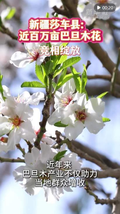 眼下,新疆莎車縣近百萬畝巴旦木花競(jìng)相綻放,粉白色花朵綿延成畫,芬芳隨風(fēng)飄蕩。