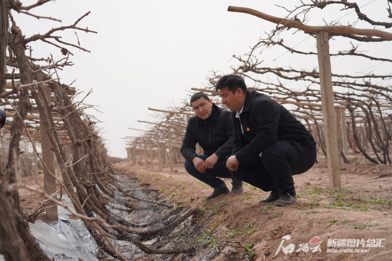 4月7日,在鄯善縣吐峪溝鄉(xiāng)洋海夏村葡萄地,村民艾海提·買(mǎi)買(mǎi)提(左)與村干部查看微噴灌管網(wǎng)水壓。加帕爾攝