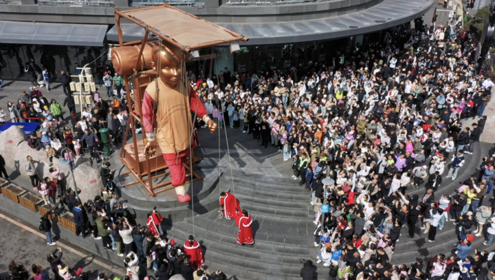 游客在長(zhǎng)春“這有山”文旅小鎮(zhèn)觀看“開山”表演。(受訪者供圖)