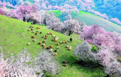 你且看伊犁河谷——蜿蜒的山坡披覆錦繡,層層疊疊的粉白自谷底漫卷山腰。風(fēng)起時(shí),花瓣簌簌飄落,遠(yuǎn)處的牧人勒馬駐足。恍惚間,難辨是大地托起了云霞,還是云霞墜入了人間。