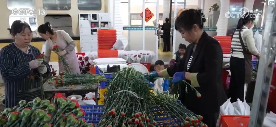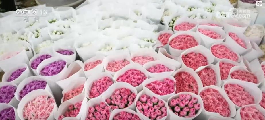 在昆明一家花卉貿(mào)易公司,記者看到,工人們正加班加點(diǎn)對(duì)剛剛集中采購回來的康乃馨進(jìn)行二次分級(jí)包裝。