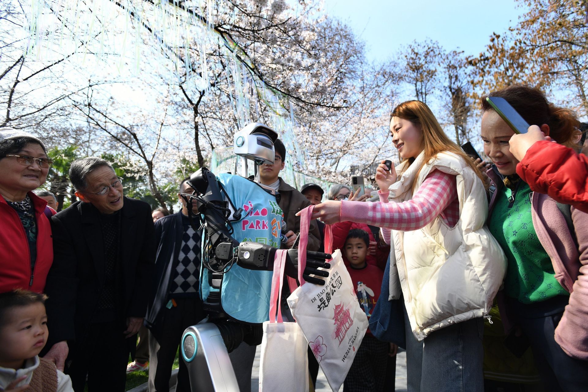 3月16日,武漢大學櫻花大道上,一臺身著黑色馬甲的人形機器人“智警小珞”穿梭在賞櫻人群中。