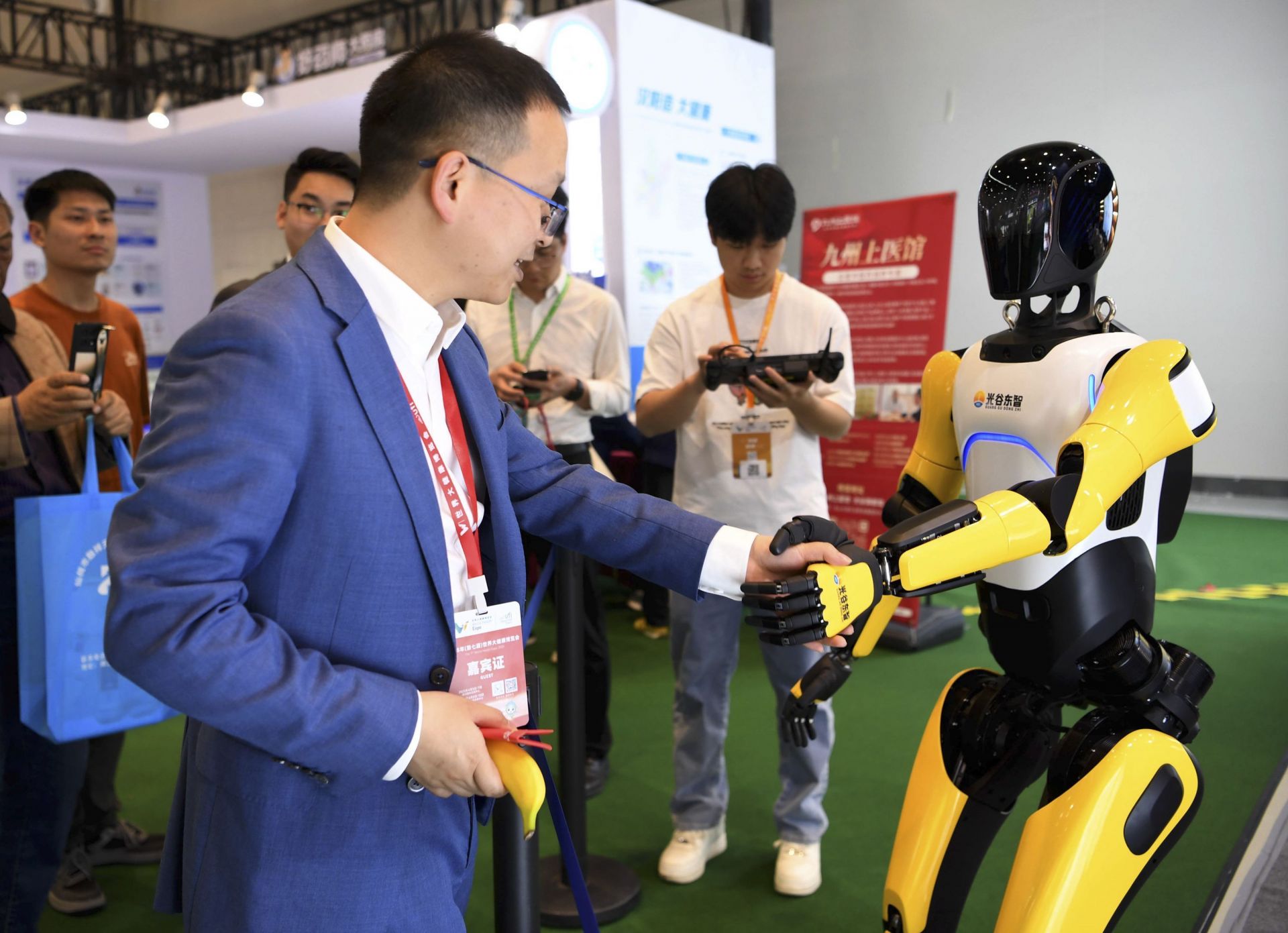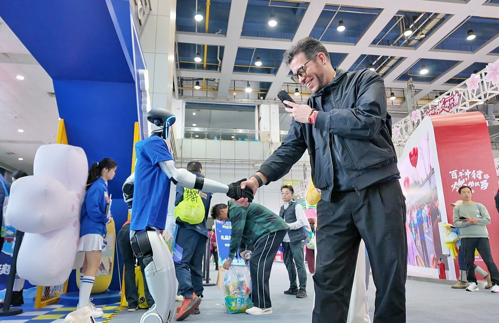 3月20日,在武漢國際會展中心,2025武漢馬拉松迎來了首個參賽選手報到領物日。委內(nèi)瑞拉選手吳瑞龍看見人形機器人志愿者,開心地上前與它握手。